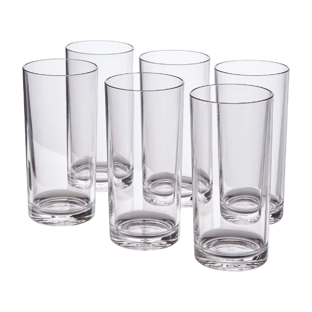 Classic 16-ounce Plastic Water Tumbler Clear Set of 6 – BPA Free and Dishwasher Safe. This is the perfect everyday drinking cup. It is great for indoor dining and outdoor parties. Durable material that will not shatter like glass. Made in the USA, 16-ounce maximum capacity, BPA-free dishwasher safe.